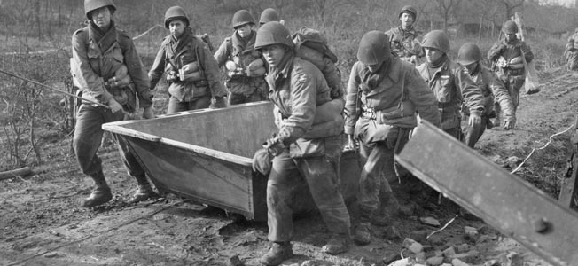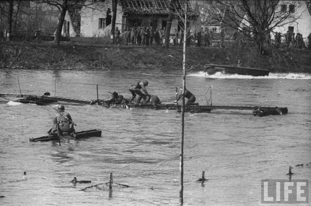 Germany. The terrific barrages before the assault boats took off for the far shore. 88s and air bursts pay us visits. Constructing approaches for traffic, building rafts, and getting equipment across the river. Records were broken and the Navy getting the credit. Citations received for a job well done. Road work around Dinslaken and extra meat rations. The deadly Rhine-Herne canal and death to buddies Mullikin, Booth, and Chaires. Ascheberg with a good rest, ball games, and a little blacktop work. The castle and isolation, the Elbe River, and another possible crossing. Deer season opens with a bang. Our country estate after crossing the river, riding horses, and target practice. Acquiring pistols and watches as the war came to an end. Minesweeping the airport.