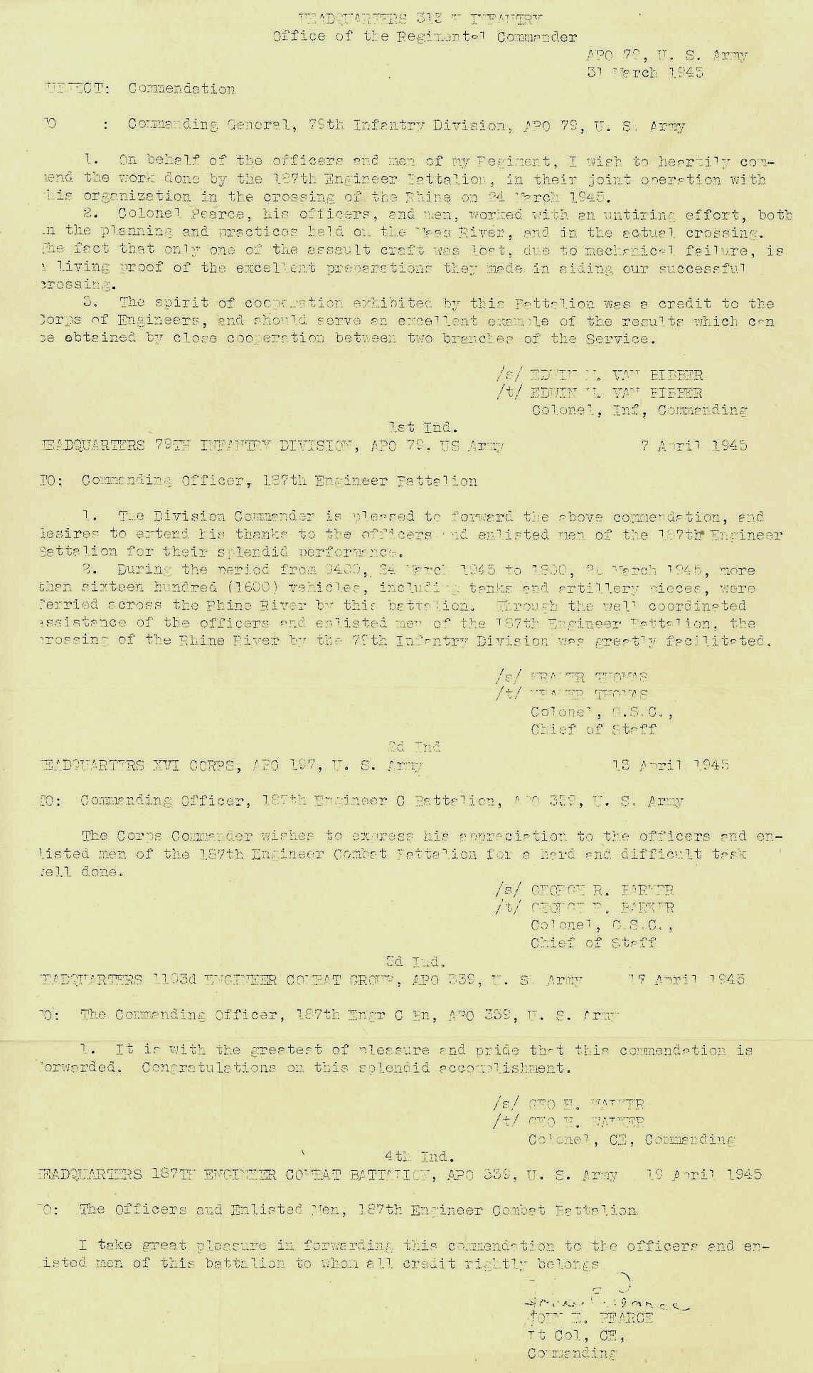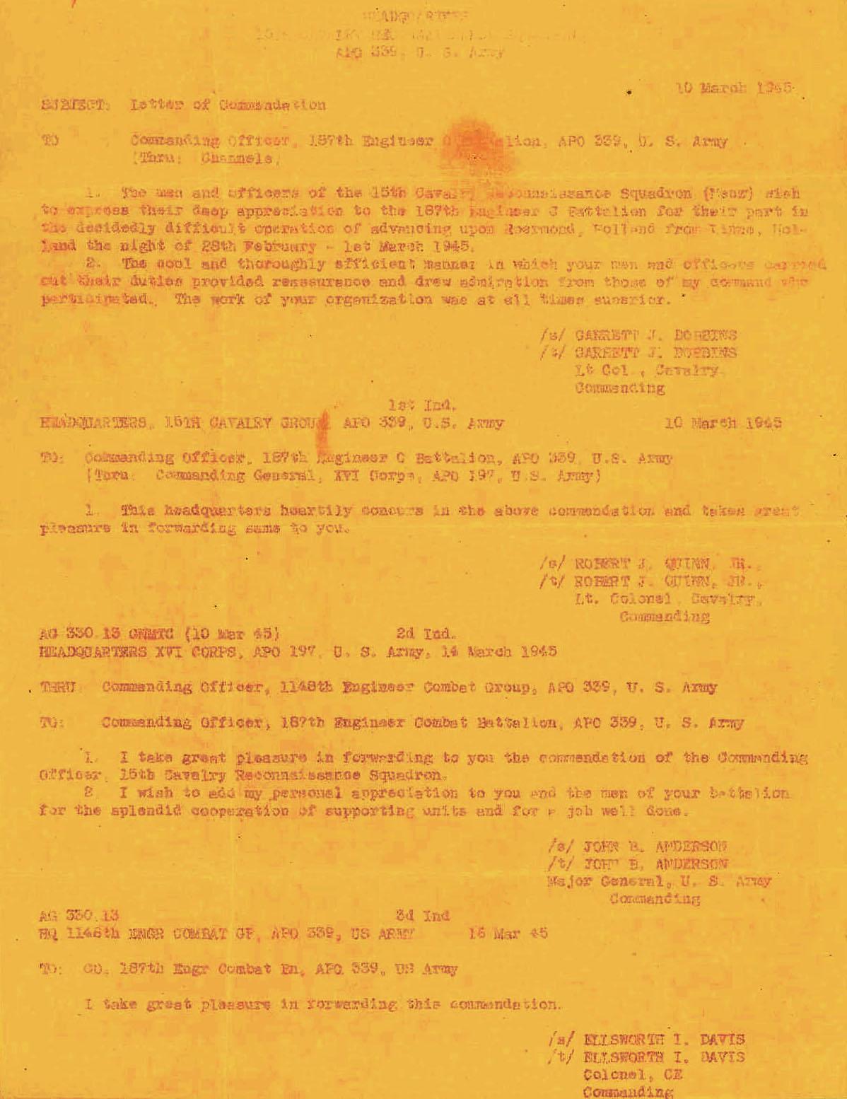 187th Engineer Combat Battalion commendation by the 15 Calvary Group 1945