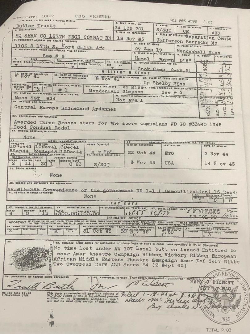 Please Note in the photo below the 3 Bronze Stars awarded to this individual. Mr. James Truett Butler was also one of my dad's best friends during his time in the 187th ECB. David Butler contacted me and provided a Photo of my Dad sitting on a German 109 fighter plane. My father talked about finding some German planes in a forest. But at that time, I could not connect the story. Now I can! I feel very lucky I received this photo of my Dad. One of my Treasures in life!