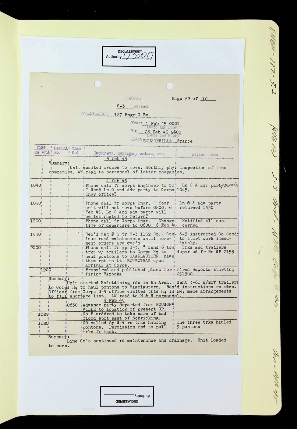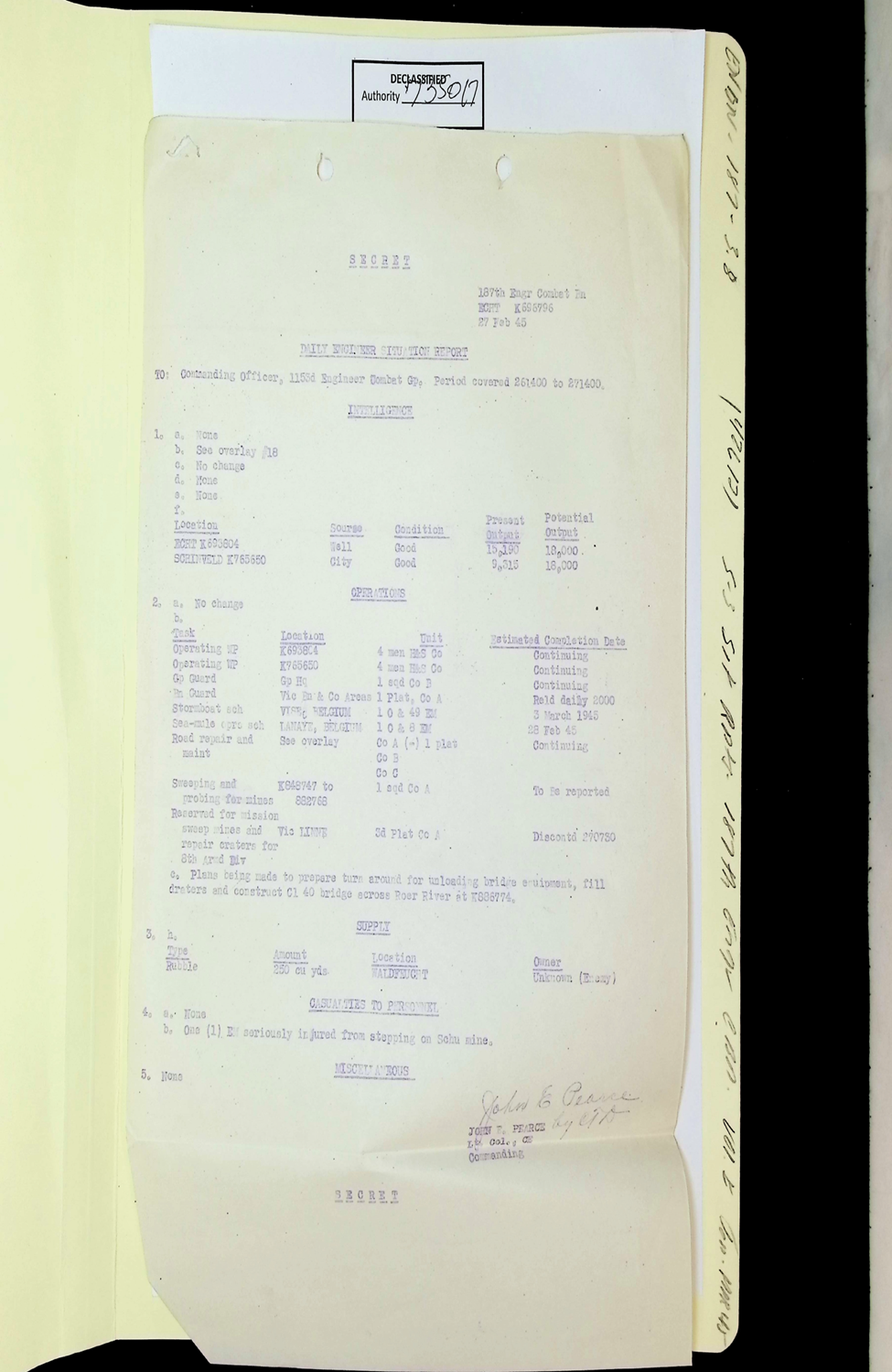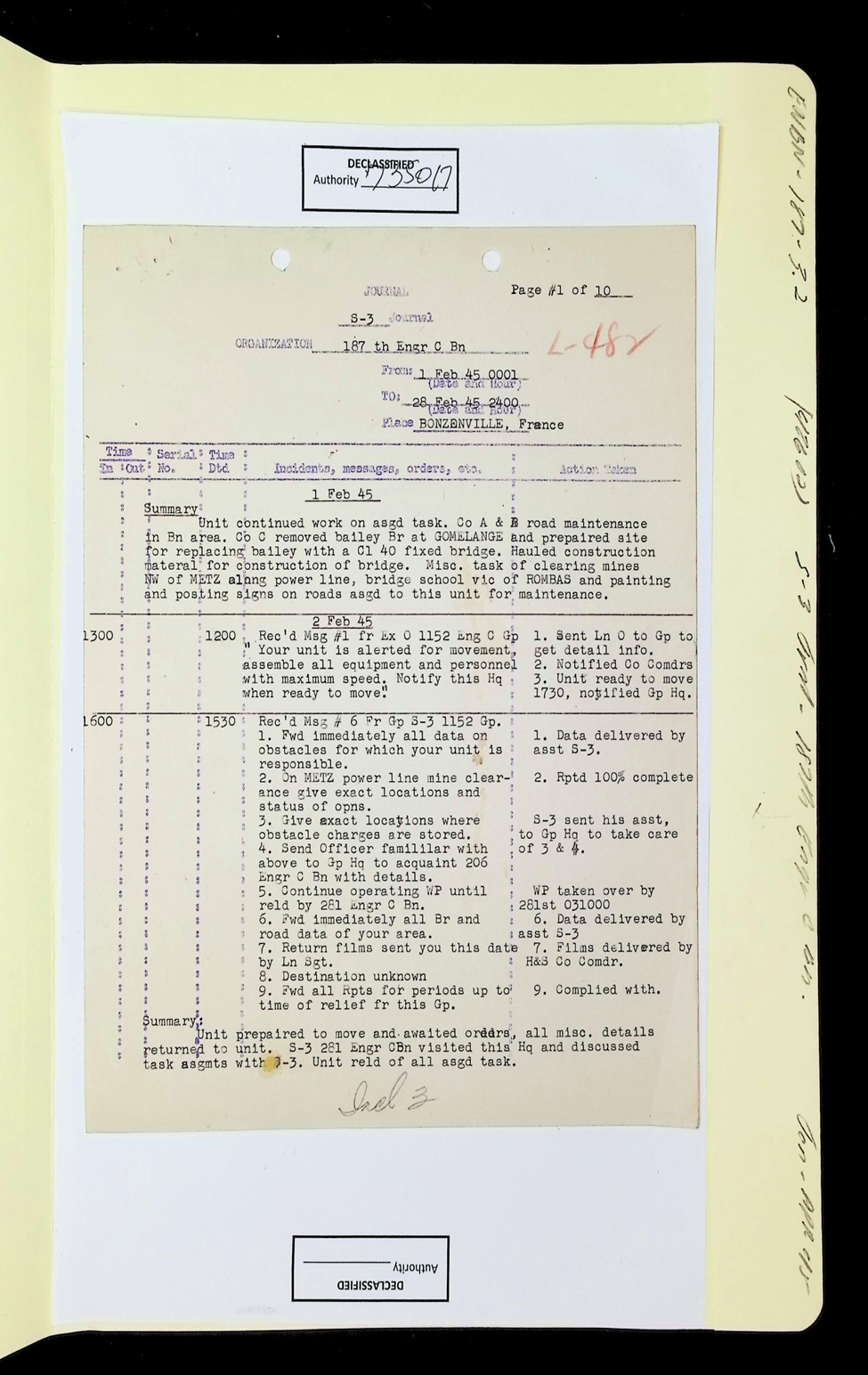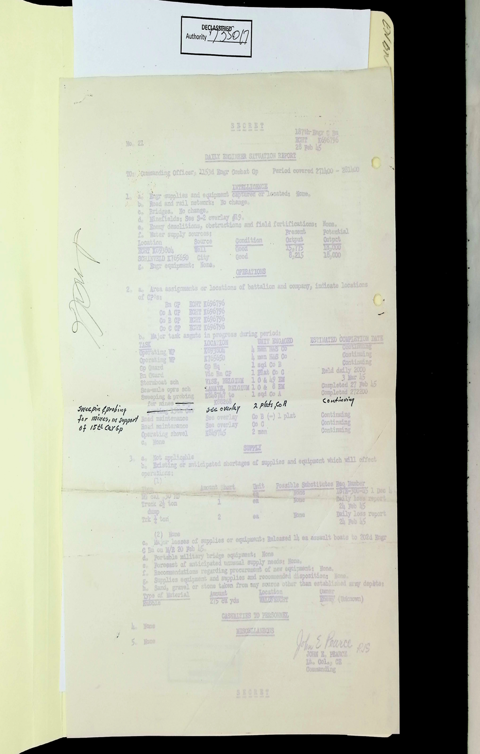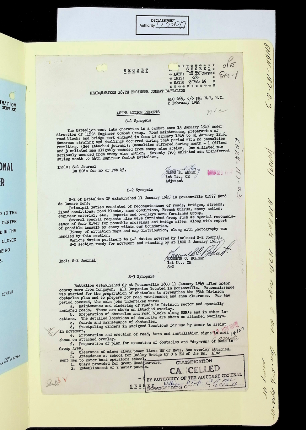 187th Engineer Combat Battalion Daily Situation Reports S-4 February 1945