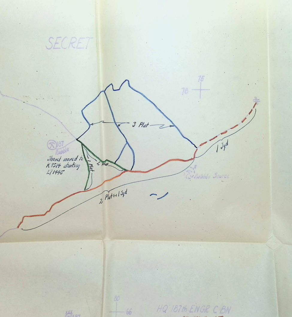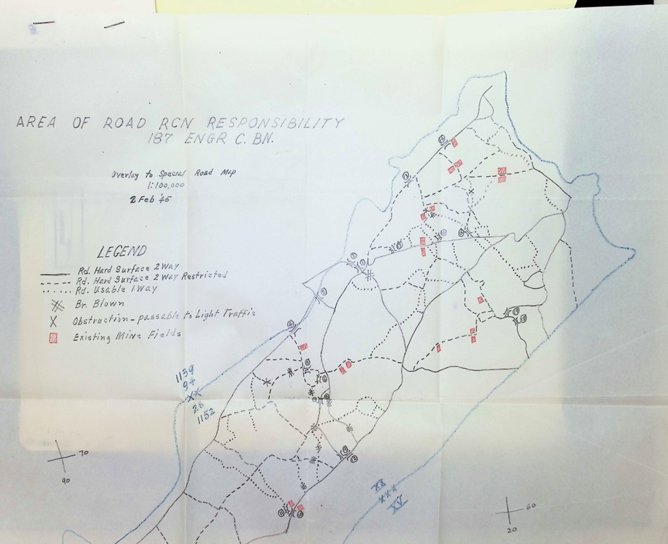 Some documents will be hard to Read. Some with be out of order, but I tried to keep them in line with dates I could Read Clearly. Maps if you use Google Earth you can locate the roads they were working on. Some information might be sensitive for some individuals. We are still looking for Group Photos of the 187th Engineer Combat Battalion. We are willing to pay for the Photos if you have one.