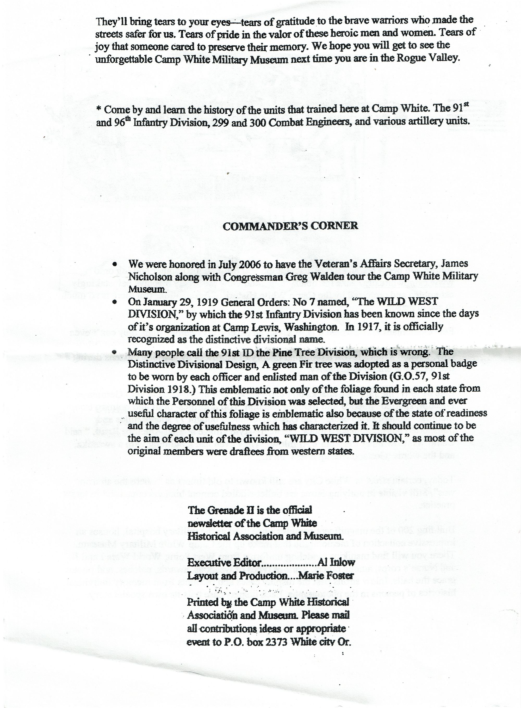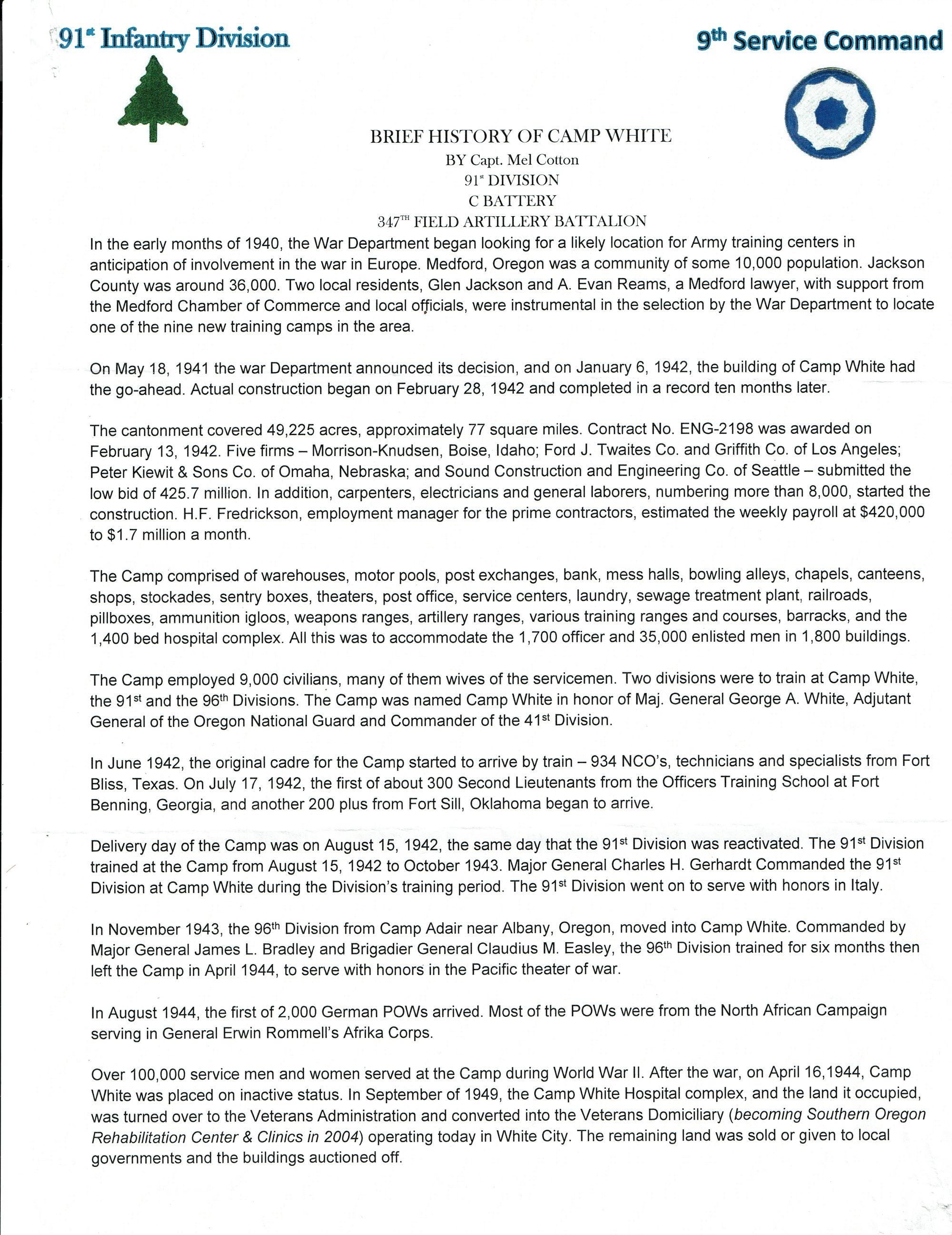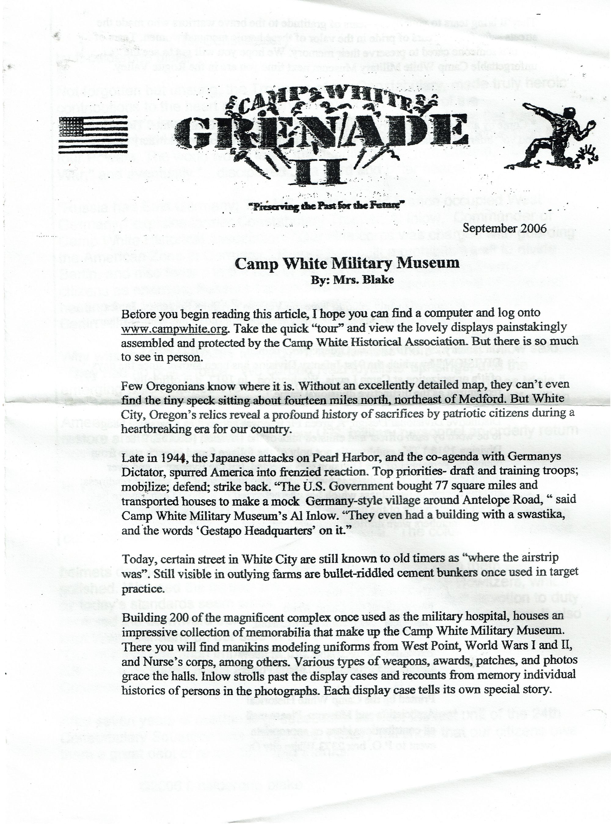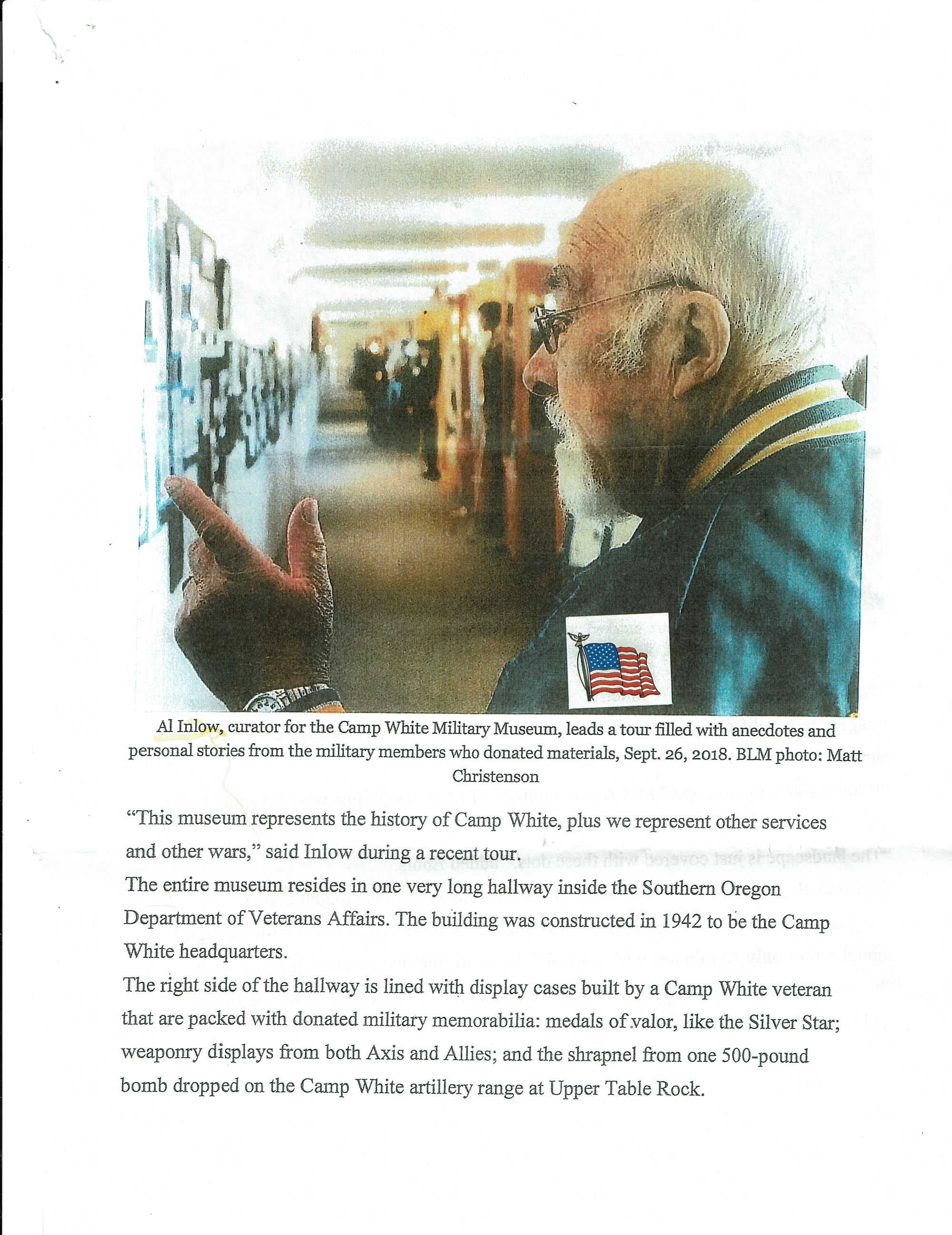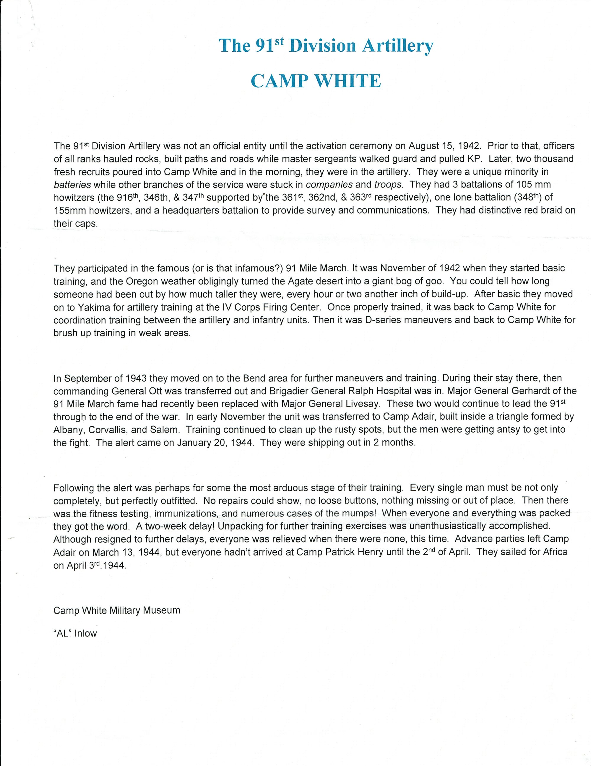 Thanks to Al Inlow, Museum Curator at the Camp White, Oregon museum