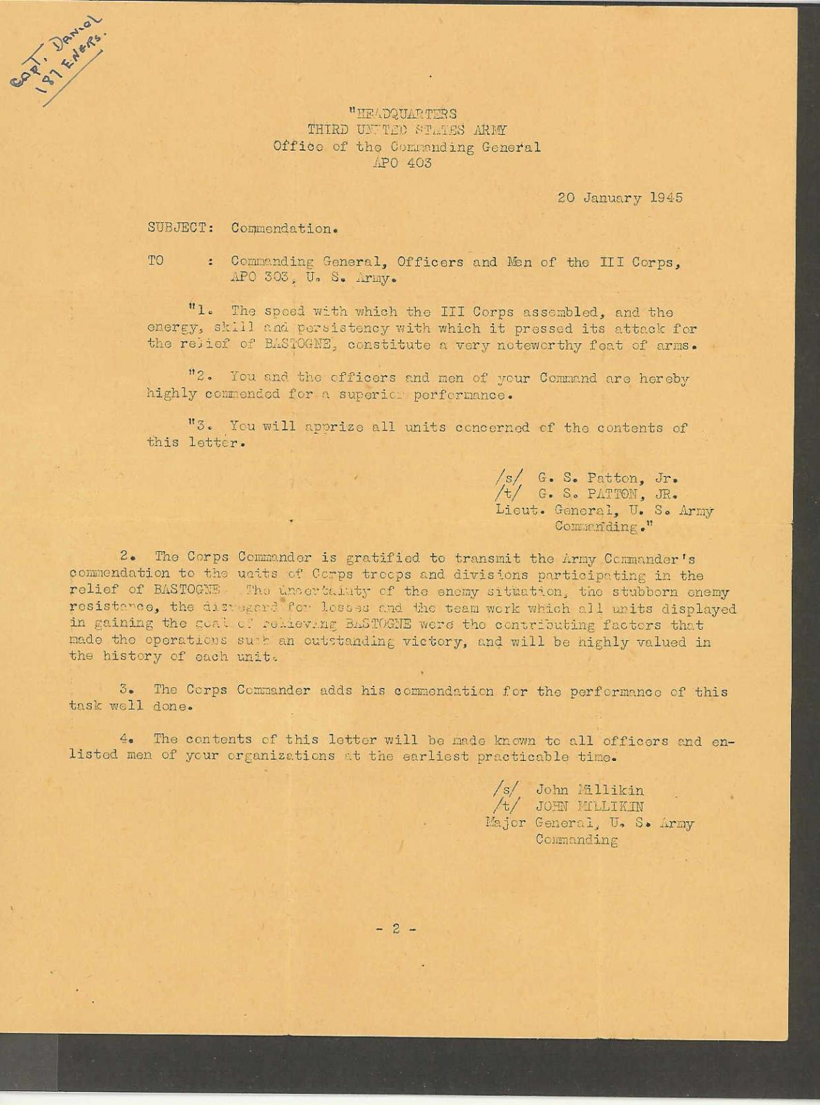 Commendation for the relief of Bastogne 187th Engineer Combat Battalion