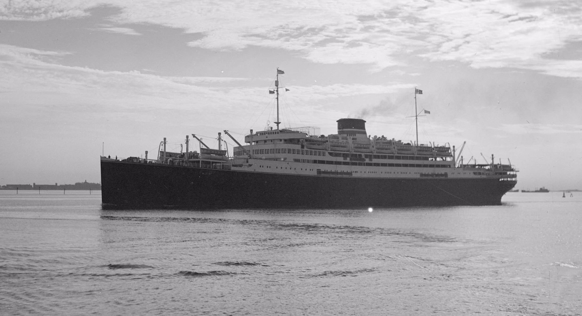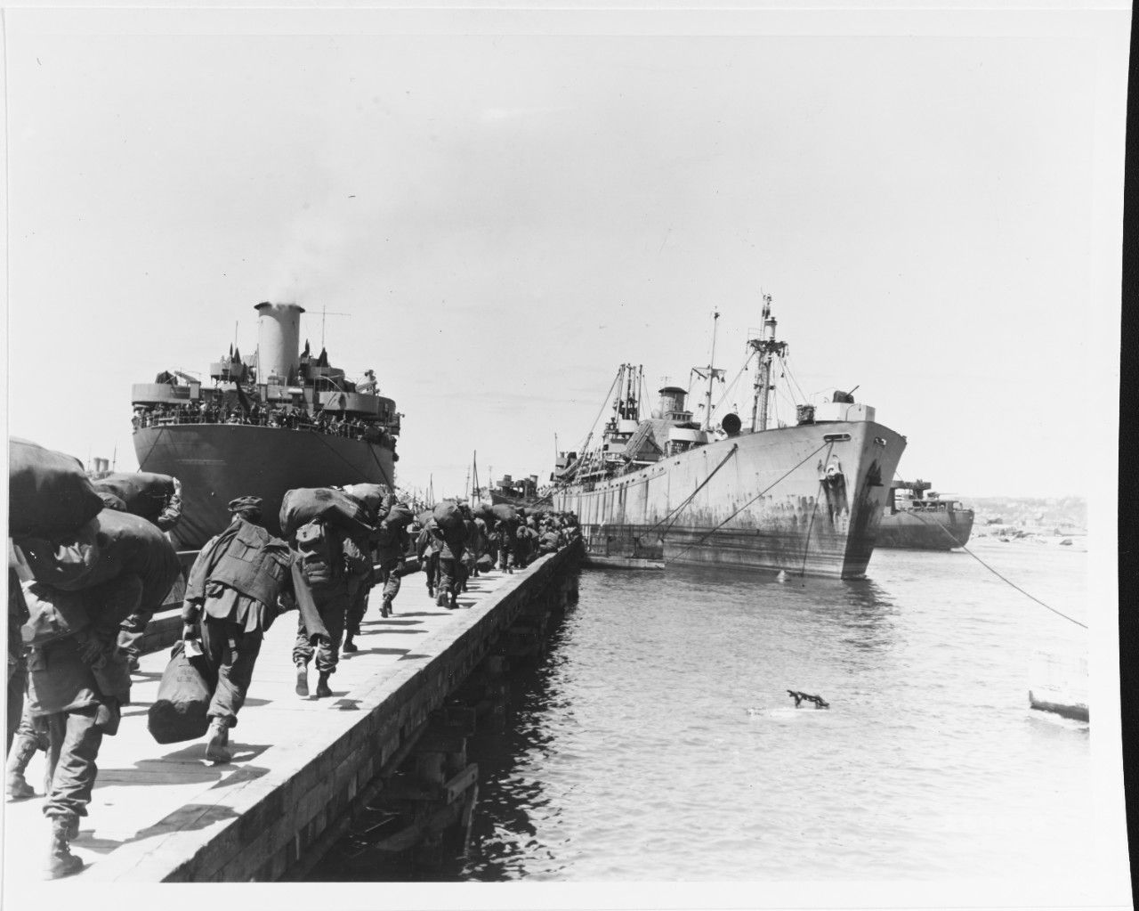 The following day, after a final inspection, the 187th marched aboard an army transport, General Horton, and was carried down Long Island Sound to the Brooklyn Port of Embarkation. At Pier #4, carrying all their equipment, the men struggled aboard the Italian motor ship, Saturnian. The 187th was the first unit aboard and Col. Peace was appointed troop commander. The battalion was given ship duties, H&S and Baker company as ship guard and MP's, Charlie company as kitchen details, and Able company as Auxiliary gun crews.