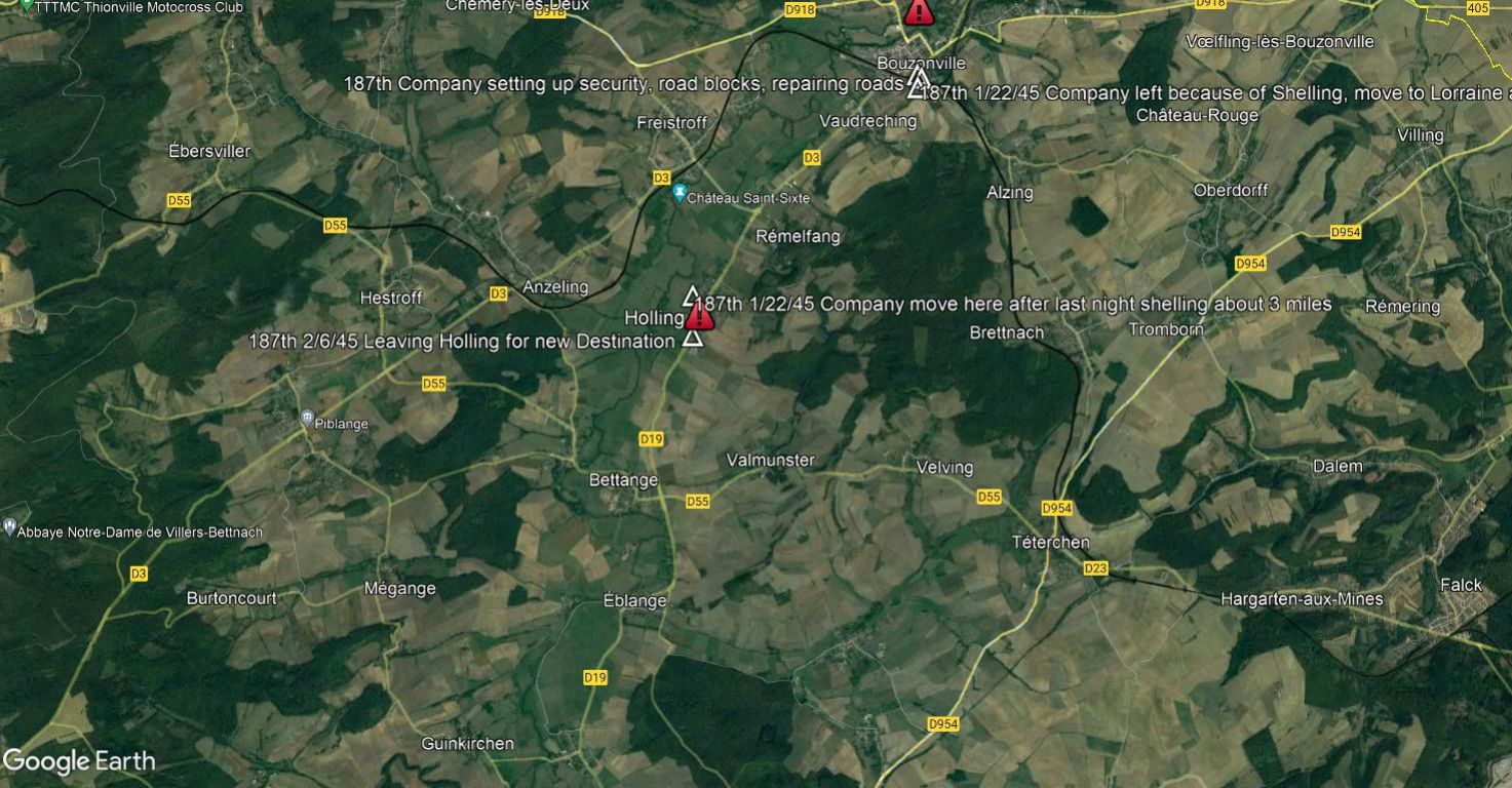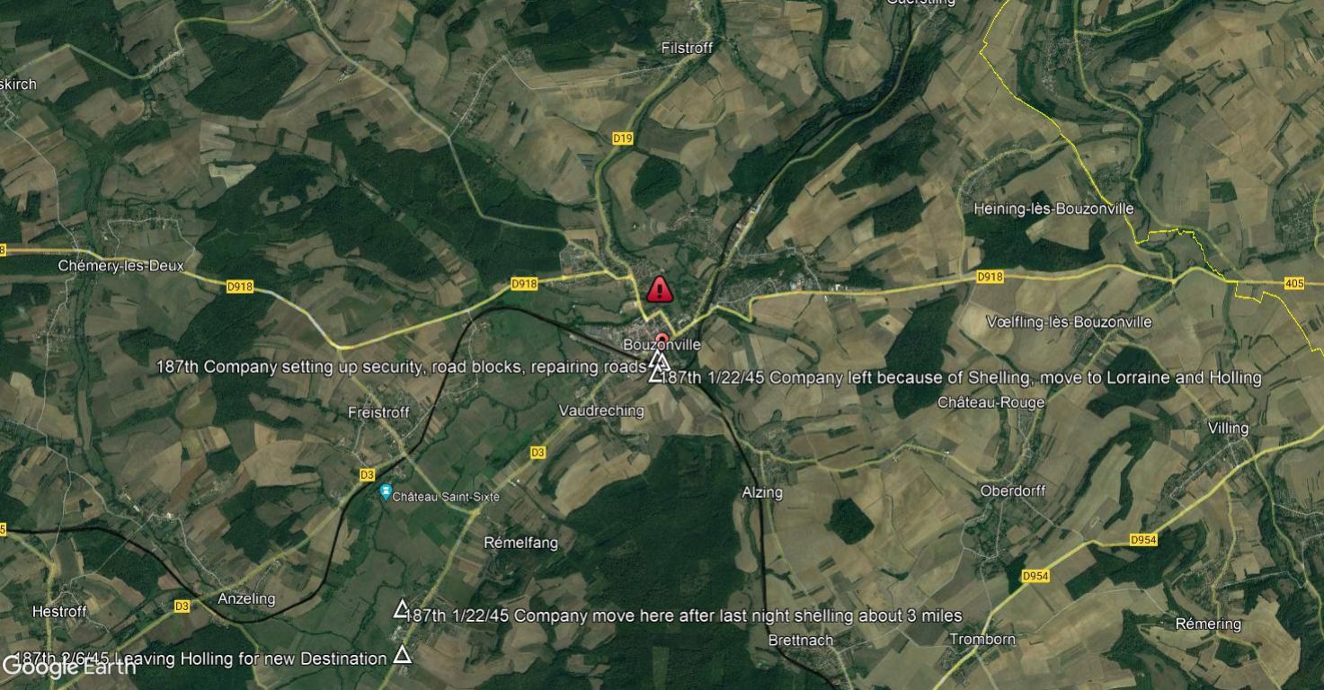 Line companies moved out of Bouzonville the last week of January to smaller towns closer to their work. Able company moved to Holling, Baker to Bettange, and Charlie to Gomlange, all within 10 miles of the CP.