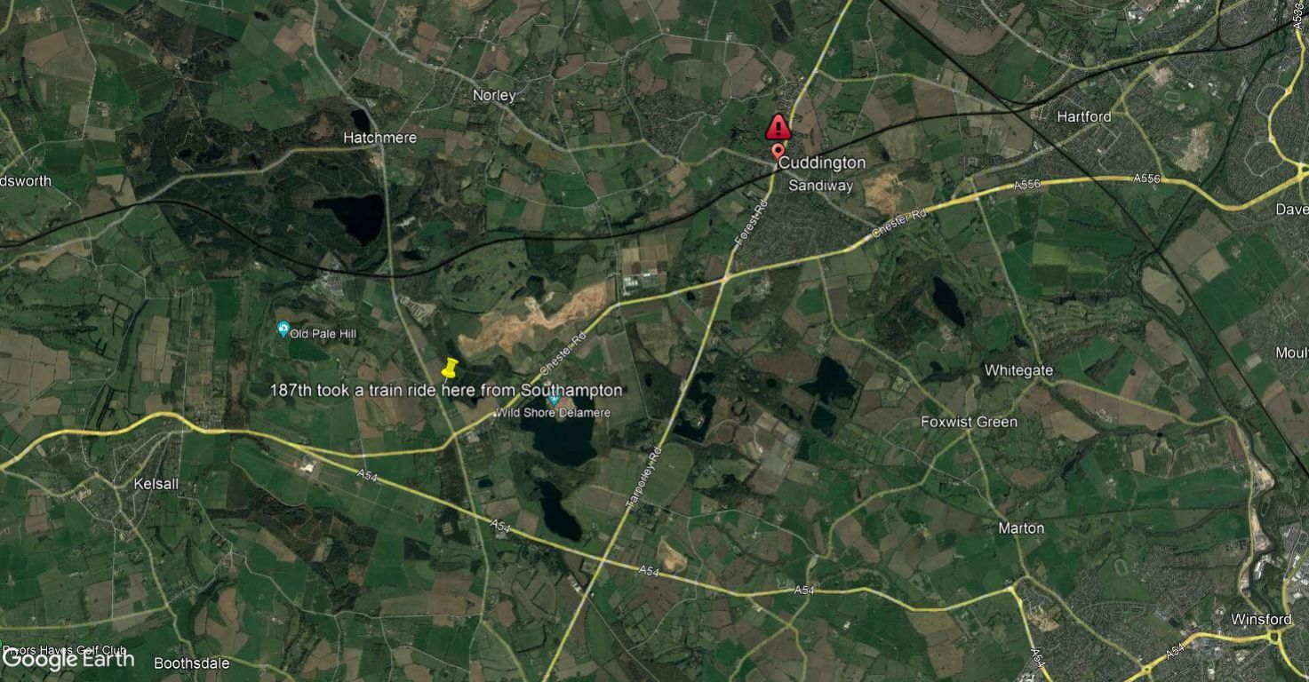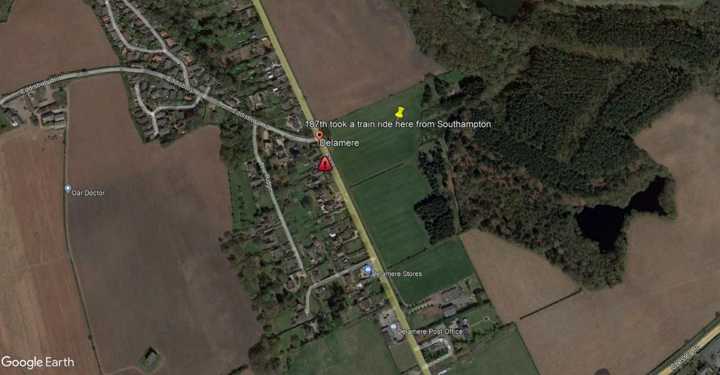 Unloading took several hours, during which doughnuts and coffee were supplied by the Red Cross. By early evening the last train loaded with men of the 187th left Southampton for an eight-hour ride to Cuddington, Chester, England.