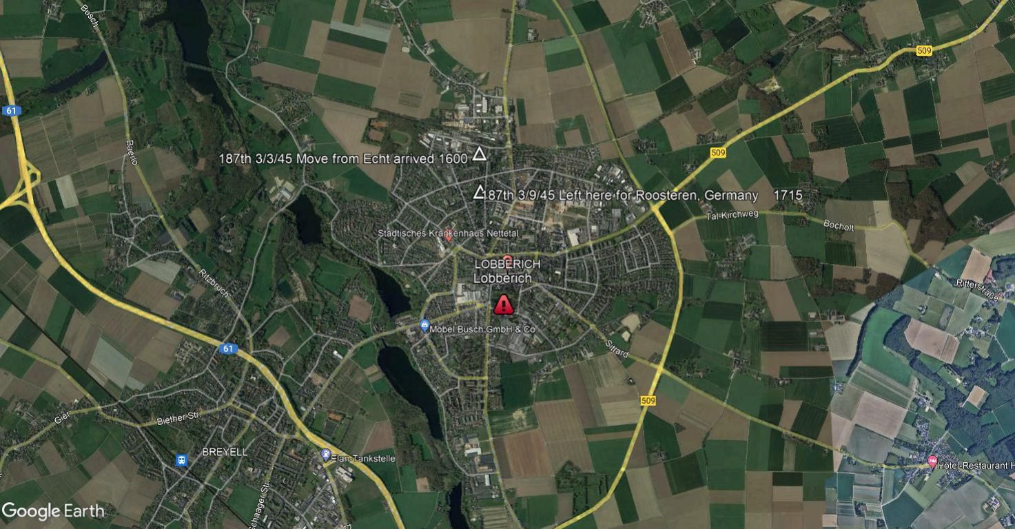 On march 3rd, the 187th moved into Germany and set up its command post in Loberich. Charlie company secured billets just outside the city of Breyell. Billeting parties arrived in Lobberich while the last enemy resistance was being crushed.